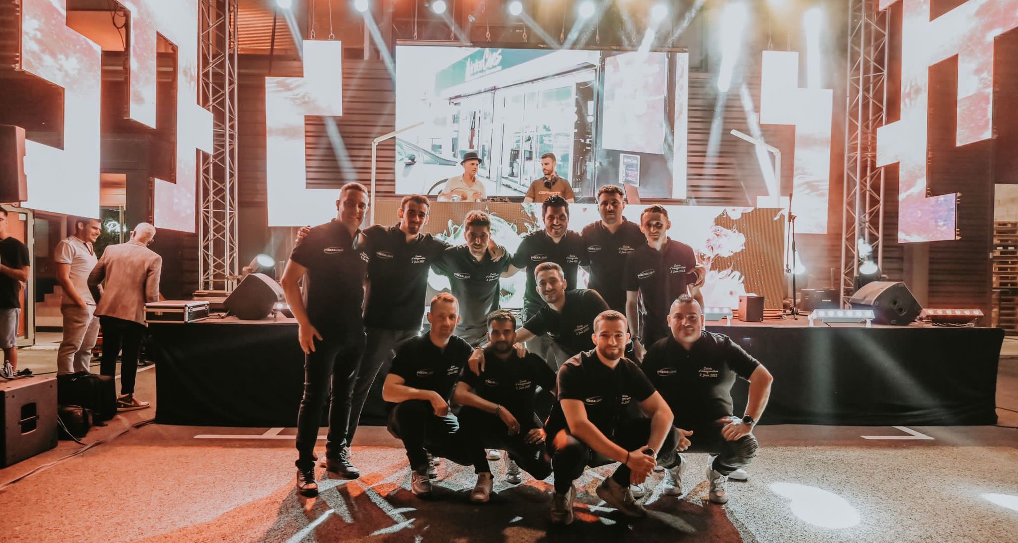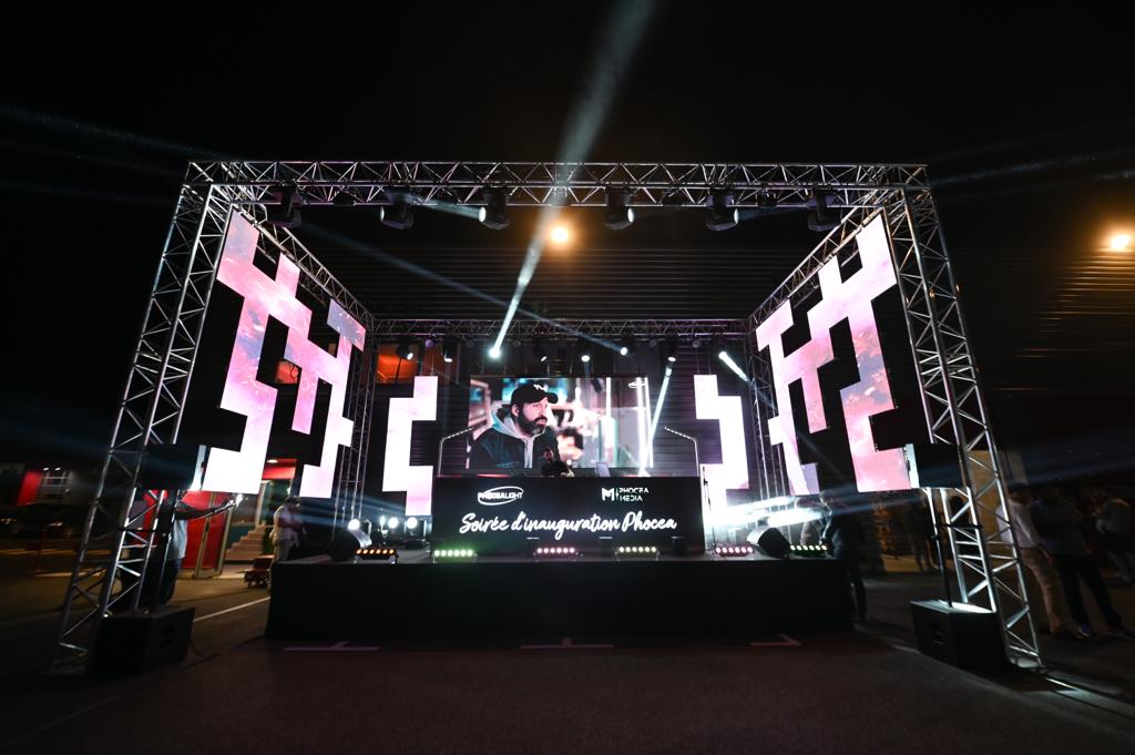 Mais la soirée était à l’extérieur avec une très belle scène pour accueillir les DJs. Equipée de tout le matériel Phocea Light : 30 projecteurs, 40 lyres et des Sparkular étincelles ! Derrière les DJs on pouvait apercevoir sur un grand écran LED tous les projets Phocea Light et Phocea Media. Devant la cabine DJ se trouvait un bandeau d’écran LED, et sur les côtés toujours de l’écran LED mais avec des formes géométriques venues d’ailleurs ! On vous laisse voir le résultat en vidéo plus bas ! En bref, on pouvait retrouver toute la gamme de produits Phocea à cette soirée, de l’écran LED en passant par les Lumileds !