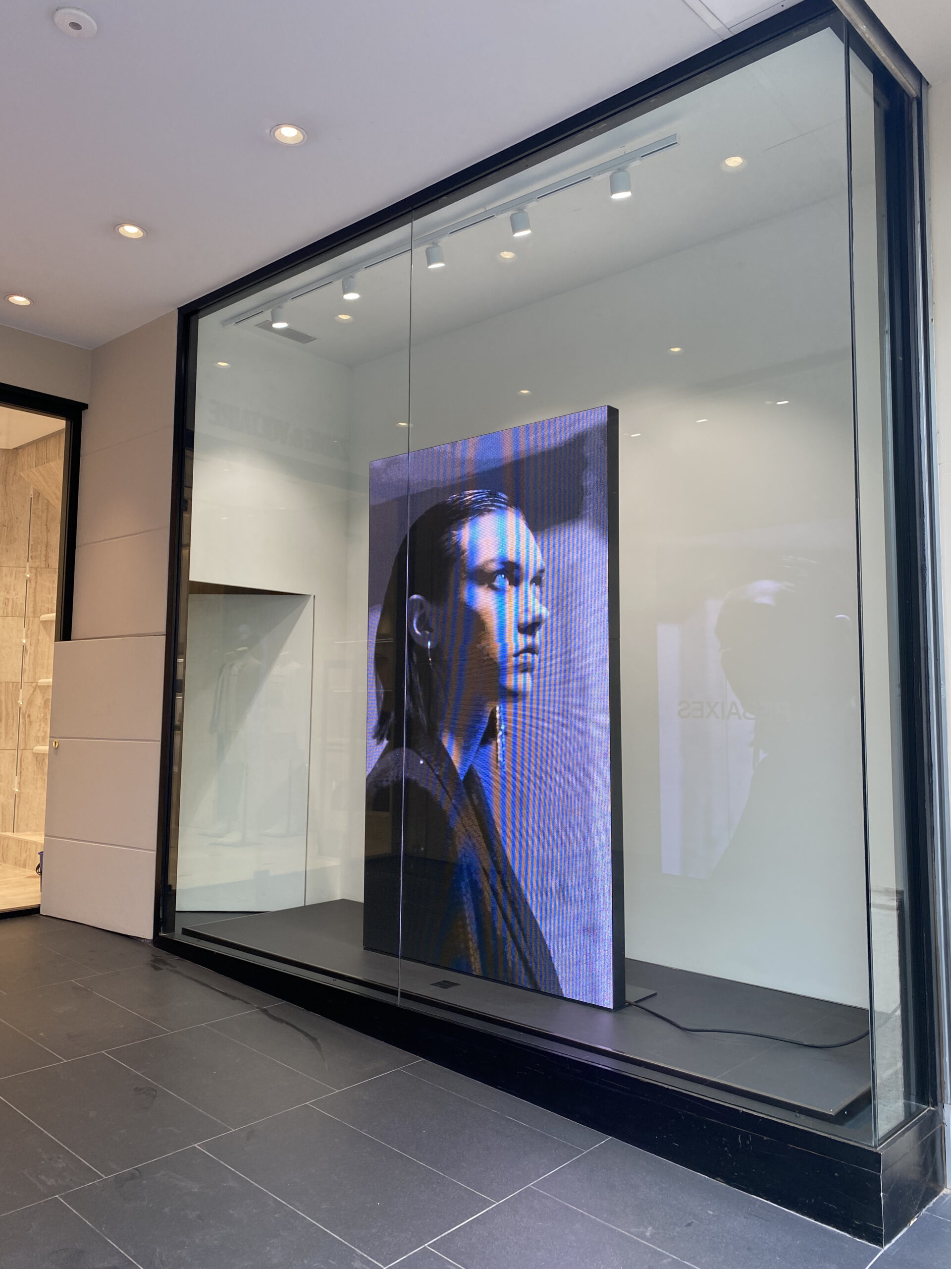 En 3h de temps les deux écrans leds sont installés dans chacune des vitrines. L’accès est assez restreint surtout pour le passage des coques en acier.